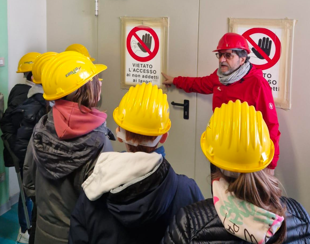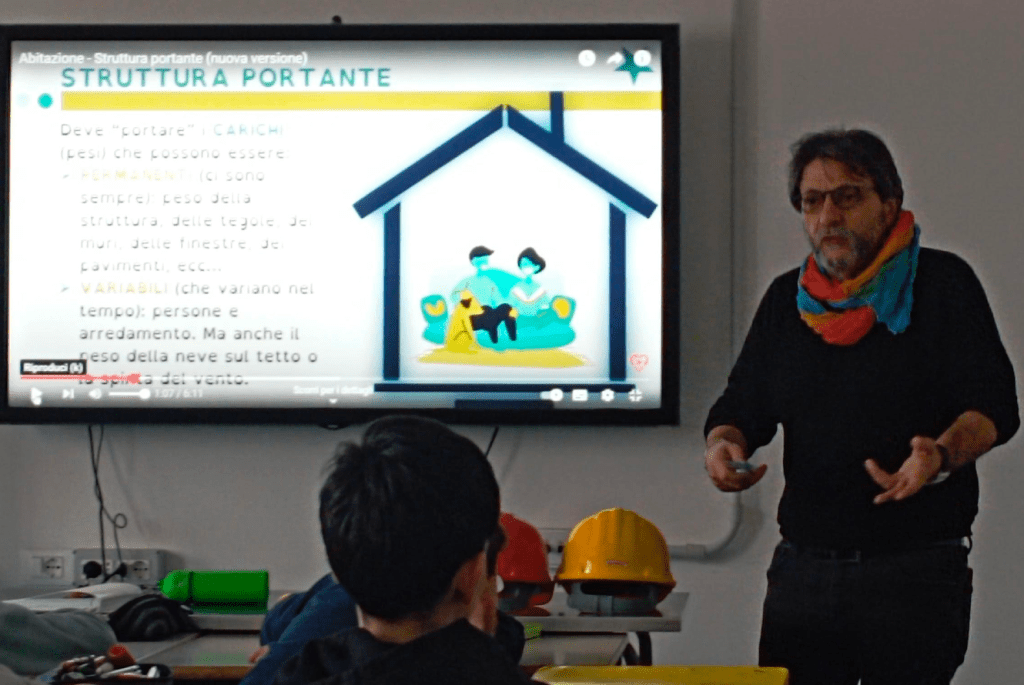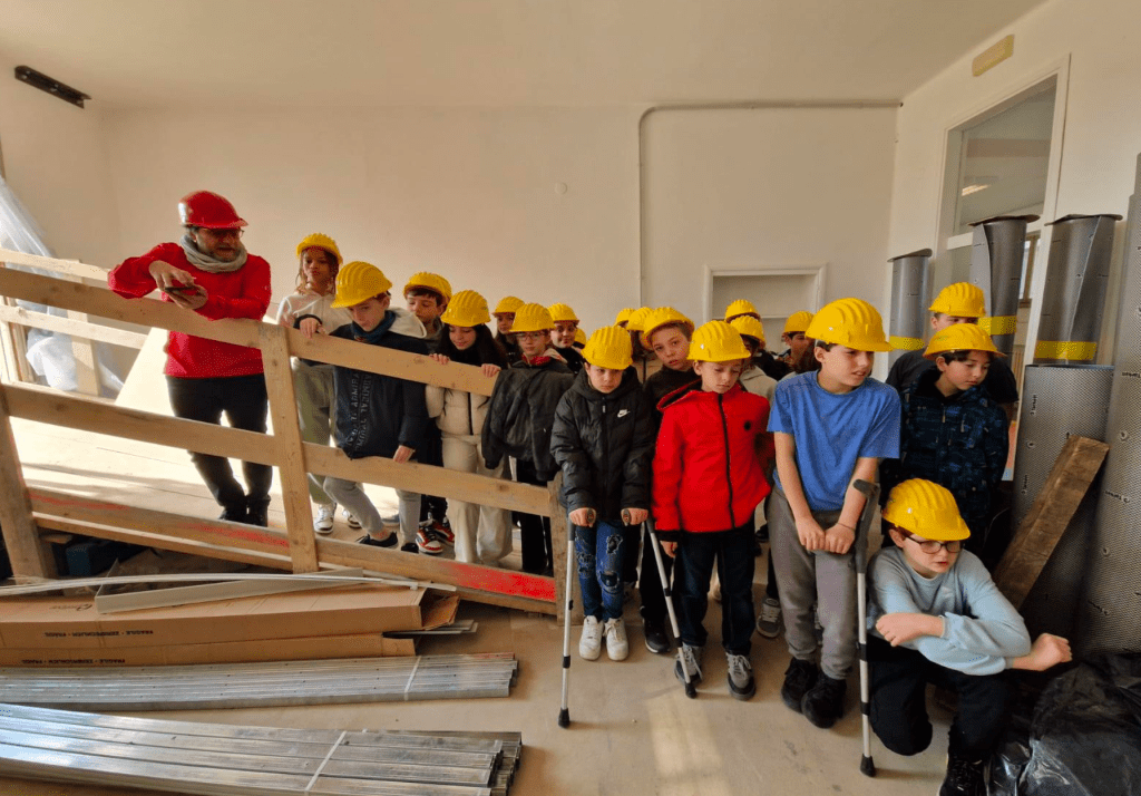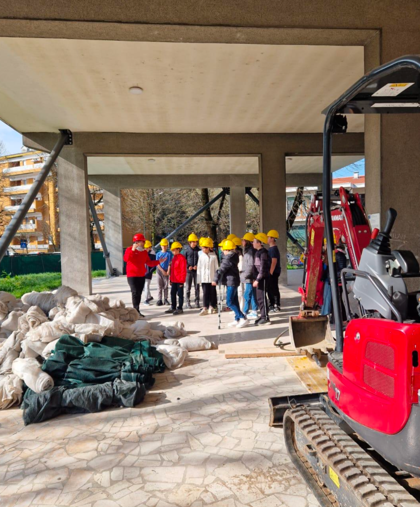 La classe ha effettuato un sopralluogo nel cantiere della propria scuola accompagnata dal prof. Custode (esperto in sismica), osservando i lavori per il miglioramento antisismico dell’edificio: travi in acciaio, reti in fibra di carbonio, impalcature. Gli alunni hanno imparato anche l’importanza dei dispositivi di sicurezza e della collaborazione nei cantieri.